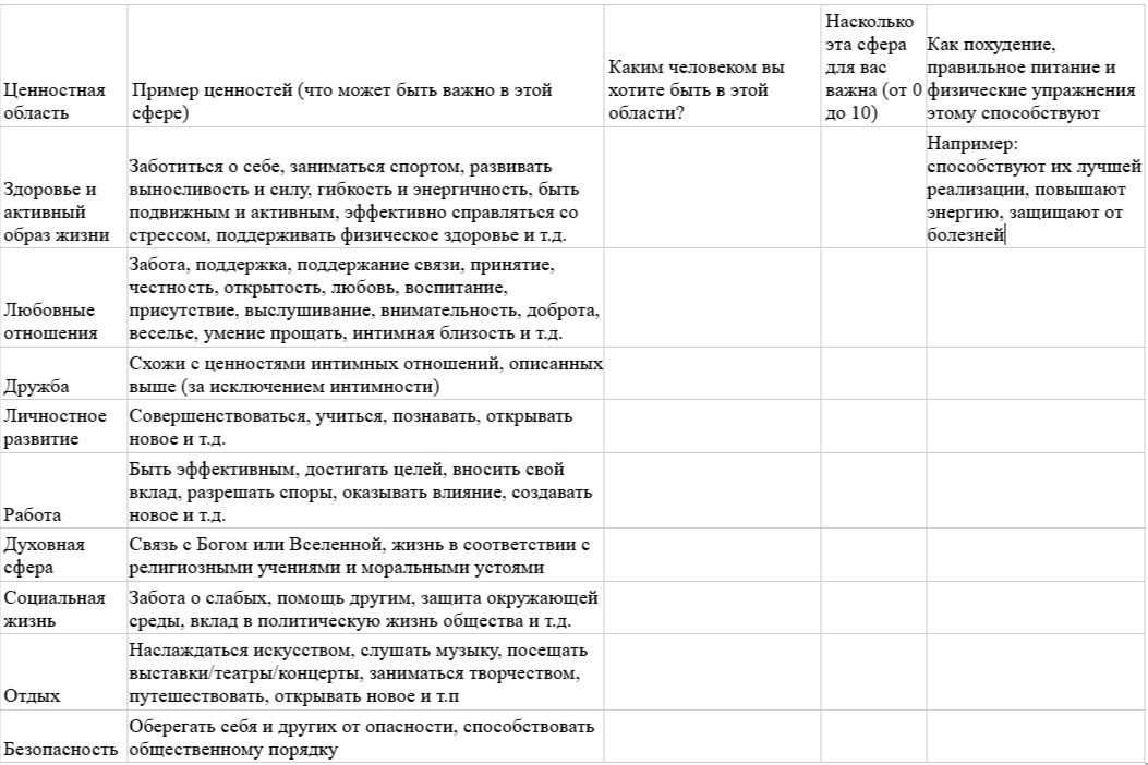 Еще один вариант упражнения из АСТ, помогающий найти глубокую мотивацию не только для похудения, но и поддержания здорового веса, правильного питания и активного образа жизни на постоянной основе. Заполните таблицу ниже. Вы можете нарисовать ее от руки на любом листочке. Колонка с примерами дана для легкости понимания, но вовсе не обязательно, что ваши ценности в той или иной области совпадут с примером. Вооружитесь вдохновением и ответьте себе на главный вопрос: "Каким человеком я хочу быть в этой сфере?" Опишите подробно. И хорошенько подумайте над последним столбцом "Будет ли похудение и ЗОЖ этому способствовать?" В конце подчеркните или выделите цветом самые значимые открытия этого упражнения.