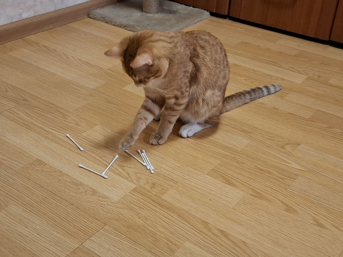 Кот повадился таскать из ванной ватные палочки. Уж не знаю, почему он решил, что это - достойный соперник, но гладиаторские бои Кот устроил по всем правилам. Скрежет когтей по паркету был сродни скрипу ножа по стеклу. Отобрала палочку и положила её на тумбочку. Отвернулась поставить телефон на зарядку - палочки нет. Кот сидит в дальнем углу комнаты, медитирует на обои и всем своим видом заранее отметает любые подозрения в адрес Его Величества. Как только погас свет - начался второй раунд поединка.