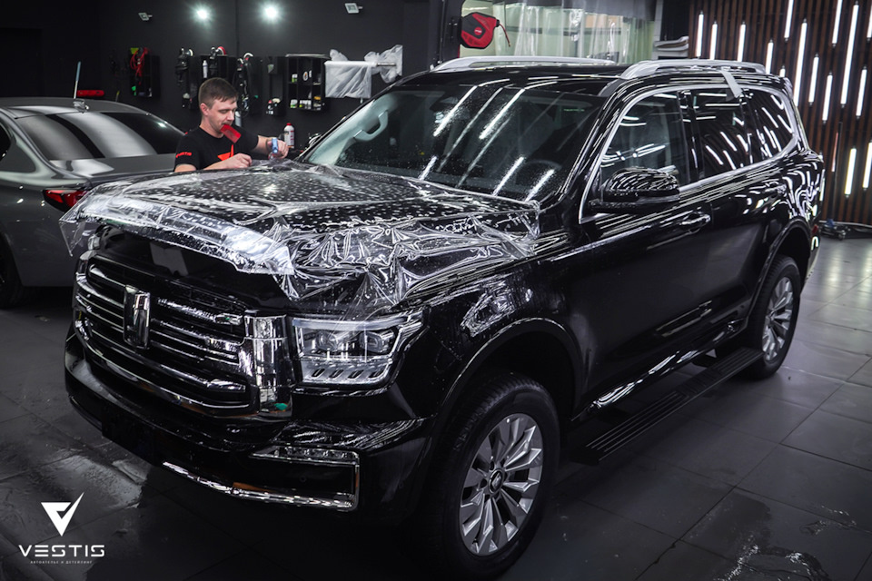 Нашими мастерами выполнена полная оклейка Tank 500. Теперь всё ЛКП на автомобиле под надежной защитой. Мы использовали прозрачный полиуретан толщиной в 190 микрон. Так же у него имеется керамический топ, а это значит что пленка будет отлично гидрофобить и цвет будет более насыщенным. Эта модель авто у нас часто приезжает на установку приложений. Мы ставим большой пакет софта, в который входит навигация, кинотеатры, магазин Rustore и т.д.