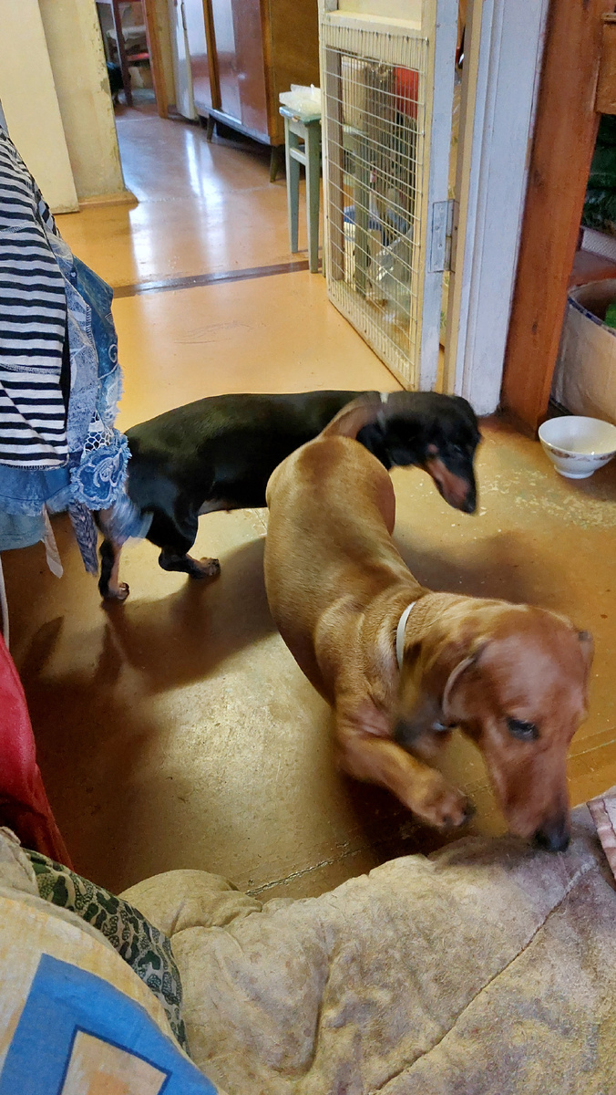 Масяка и Мотя, две сестры, которые на протяжении всей своей жизни, не разлучались даже на три часа. И течки у них проходят синхронно. Теперь это две су.ки с низкой социальной ответственностью, которые нагло желают чудесно провести время со всякими кобелирующими личностями. А пока они гордо ходят и хвастаются друг другу своими здоровенный свистками и умением элегантно отводить хвост. При этом они часто зовут в арбитры свою мать, Пулю, которой все это уже надоело) При этом, Сладуны не забывают хорошенько пожрать, выпросить что - то повкуснее, и пособачиться как следует у двери, или на балконе. Ни минуты покоя никому, таков девиз. Нам прибавилось забот, в том смысле, что теперь нести их вниз, по ступенькам на улицу, надо аккуратно, чтоб не измазать одежду) Такса собака азартная, бежит на прогулку, как Чингачгук на тропу войны, так что крайне нежелательно им это позволять. Носите на руках, чтобы не было травм. А наверх пусть идут сами, им полезно.