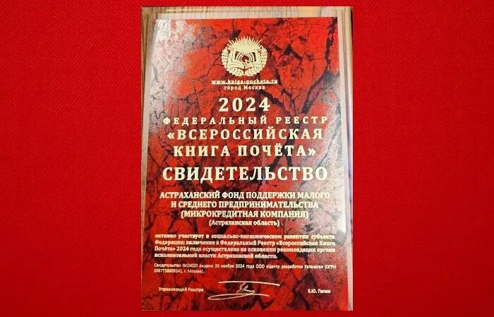 Астраханский фонд поддержки МСП включили во Всероссийскую Книгу Почета