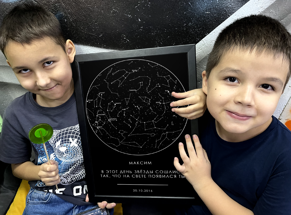 Дарим карту звездного неба при бронировании программы Дня Рождения! Обычно такие карты делаются на заказ и стоят от 5000 рублей. Мы подарим вашему ребенку не только праздник, но и такое ценное и необычное воспоминание. Вы сможете получить индивидуальную карту звездного неба и выбрать персональную лирическую подпись: