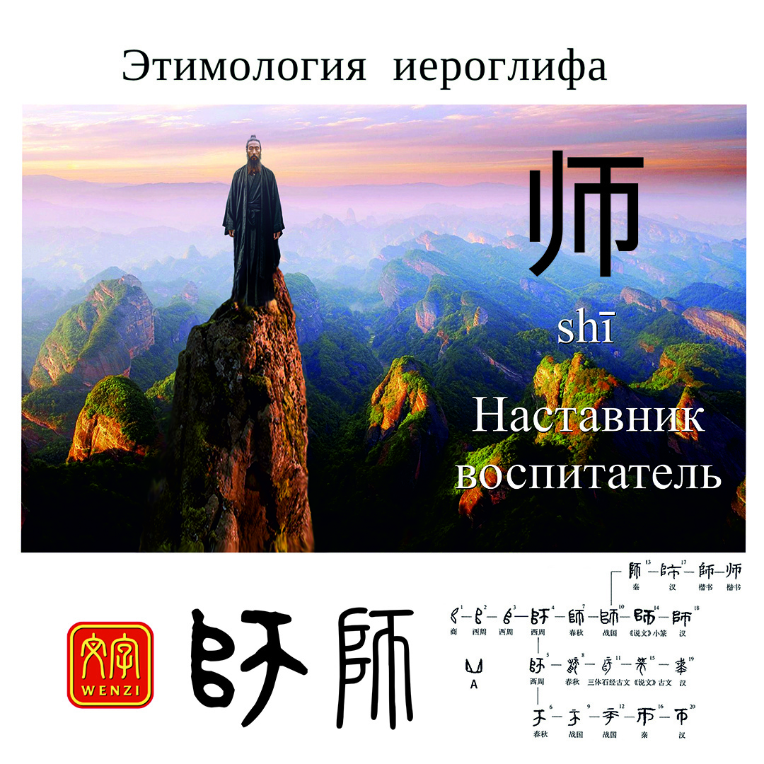 Современные значения иероглифа 师 shī: Рассмотрим этимологию иероглифа 师 shī: Иероглиф «师» (шī) изначально состоял из двух частей: левая часть — 𠂤 (阜) (duī), означала «небольшой курган» или «холм», а правая часть — 帀 (zā), представляла собой древнюю форму иероглифа «匝», который обозначал «окружать». Небольшой курган, имеющий круглую форму, символизировал множество элементов, поэтому первоначальное значение иероглифа «师» было связано с понятием «много» или «многочисленность». Благодаря идее о «множестве» иероглиф 师 со временем стал обозначать военное подразделение, что было связано с концепцией организации большого числа людей в армии. В 《周礼·大司徒》 «Чжоу ли» («Чжоуские ритуалы») приводится описание военной структуры: «Пять человек образуют 伍 (wǔ) - строй, пять 伍 формируют 两 (liǎng) - воинскую единицу из пяти пятков 两伍, т. е. 25 ратников, четыре 两 образуют 卒 (zú) - военную сотню, пять 卒 образуют 旅 (lǚ ) бригаду - отряд в 500 человек (дин. Чжоу), а пять 旅 бригад образуют 师 (shī) дивизию». П