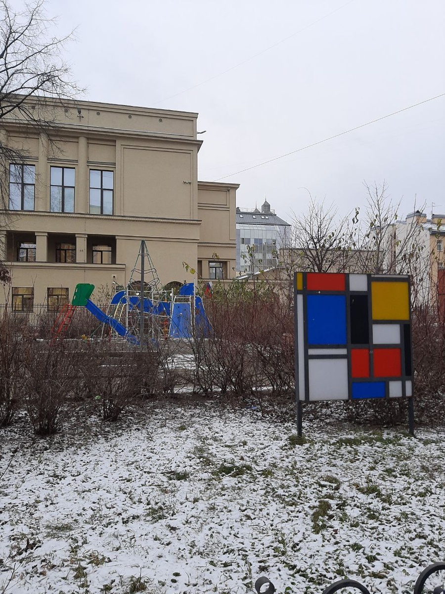Любите ли вы гулять по задворкам Лиговки, как люблю я? И не в поисках ужасов нашего городка, а в поисках красивого и познавательного. И такого много в этих местах. Вот, например, Мондриан. Стеклянная инсталляция соперничает по цвету с детской площадкой, удивляя прохожих. Чтобы узнать подробности, надо быть очень любознательным человеком. Летом и вовсе не видно этой таблички, другое дело сейчас зимой, можно пройти по газону и раздвинув телефоном колючие ветки попытаться прочитать. Что-то там про МО Лиговка-Ямская, про Мондриана, в любом случае, давно эта история началась, аж в 2018 году, столько воды утекло с тех пор. Из энциклопедии: Питер Корнелис (Пит) Мондриан (1872 – 1944) – голландский художник, положивший начало абстрактному направлению в живописи, наряду с Кандинским и Малевичем. Решётки из чёрных горизонтальных и вертикальных линий с ячейками. Ячейки закрашивались основными цветами, то есть красным, синим и жёлтым. Надо же, как просто быть художником – раскрась квадратики кра