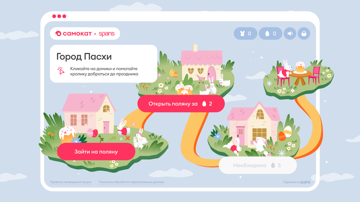 Подводя итоги года, мы обернулись назад и с радостью вспомнили, как реализовывали классные спецпроекты с геймификацией, интерактивными и вовлекающими механиками. Геймификация — отличная возможность расшевелить аудиторию, привести уникальных пользователей и вдохнуть жизнь в рутину бизнеса. Один из ярких красочных, примеров — наша коллаборация с Самокатом в рамках пасхального проекта. Мы создали интерактивный сайт, который отправлял пользователей в захватывающее путешествие по городу Пасха. В центре истории — наш герой, Пасхальный Кролик, который всеми лапами (и вашим кликом) стремится на праздничный ужин к другу. Но не все пошло гладко – на пути Кролика ждали препятствия! Но разве это проблема, когда можно немного поиграть? О том, как вовлекли пользователей в интерактив, рассказываем в кейсе. Город-сказка Итак, мы придумали яркий мини-город с интерактивными домиками, милыми персонажами и пасхальными сюрпризами. Цель — не просто осветить инфоповод вместе с клиентом, а сделать так, чтобы