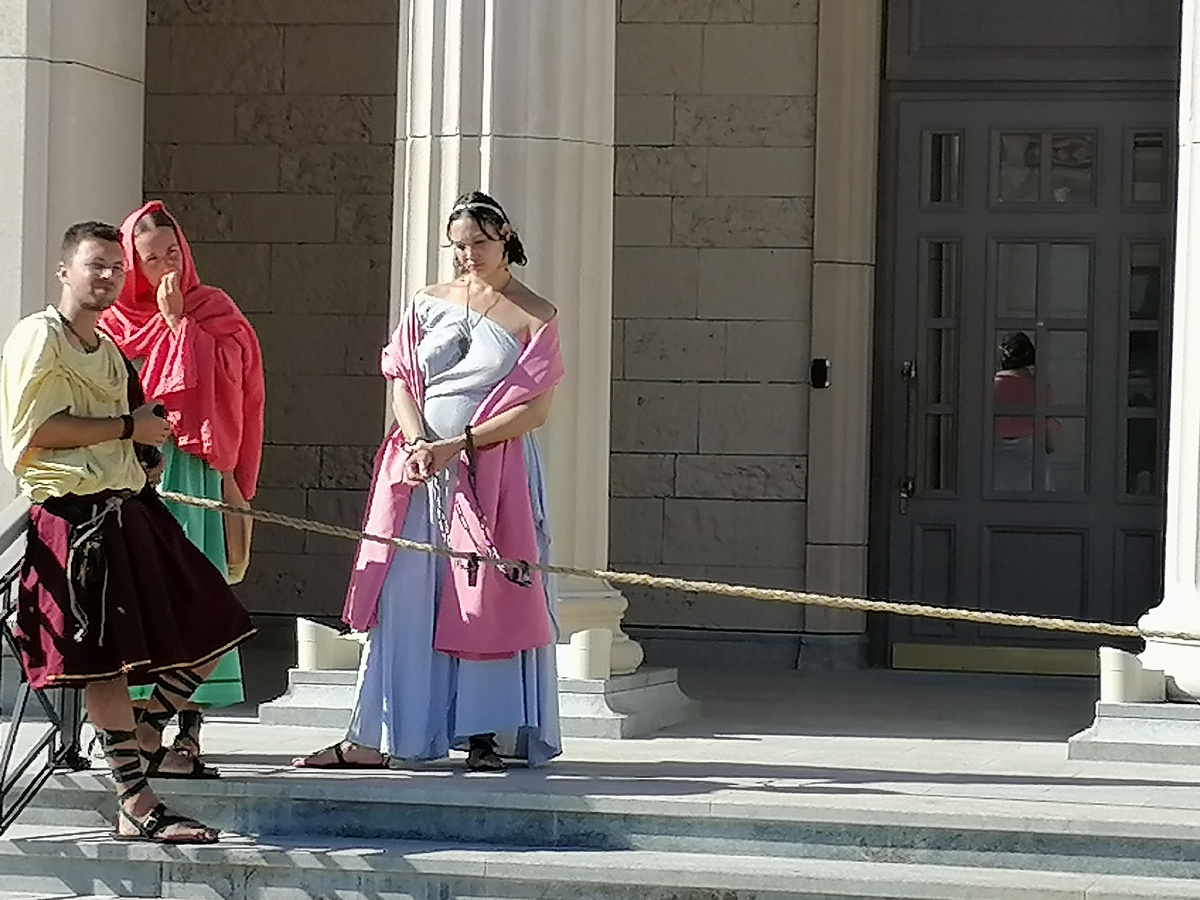 Именно такую картину я и увидела находясь в новом историческом центре Херсонес Таврический. На фото видно, что "невольница" закована в цепи, а ее "продает" наверняка богатый работорговец. Все это воссоздано современниками по многим документам и археологическим раскопкам древнего города. Новый Херсонес был построен недавно и я предлагаю просто по нему прогулять и посмотреть на городские кварталы, храмы, архитектуру. Рекомендую совершать прогулку с экскурсоводом, чтобы знать историю, а если нет на это желания, то просто прогуляться и сделать красивые фото. В рамках современного Херсонеса были построены музейные комплексы, которые служат для хранения археологических находок. Эти музеи предлагают интерактивные выставки, образовательные программы и экскурсии. Для удобства туристов были созданы: В ходе строительных и археологических работ, было обнаружено русло древней реки. Находки подтвердили существование водного источника, который использовался жителями Херсонеса в древности, специалис