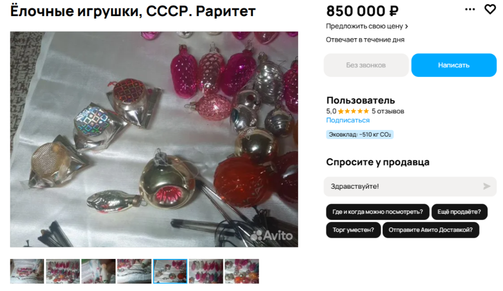 Набор елочных игрушек продают в Волгограде за 850 тысяч рублей. В описании продавец называет елочные игрушки не просто из СССР, а раритетными. Всего в наборе около 50 изделий из стекла, бусы и фигурки Деда Мороза со Снегурочкой. Стоимость одной игрушки по такому расчеты составляет около 17 тысяч рублей. Покупатели предполагают, что продавец ошибся и случайно добавил пару нулей. — Не верю, что такой набор может стоить почти миллион! И что за 85 тысяч его продадут! Даже 8500 рублей — это как-то слишком! — рассуждает увлекающаяся коллекционированием новогодних игрушек жительница Волгограда. — Рановато пока таким украшениям носить звание "раритет". Если покопаться, то на любых бабушкиных антресолях такое найдется. В 850 тысяч рублей в Волгограде можно купить недвижимость, если поискать и снизить планку. На том же «Авито» есть объявление о продаже квартиры-студии в общежитии на улице адмирала Ушакова в Тракторозаводском районе или двушки в поселке Саши Чекалина в Кировском районе, которые у