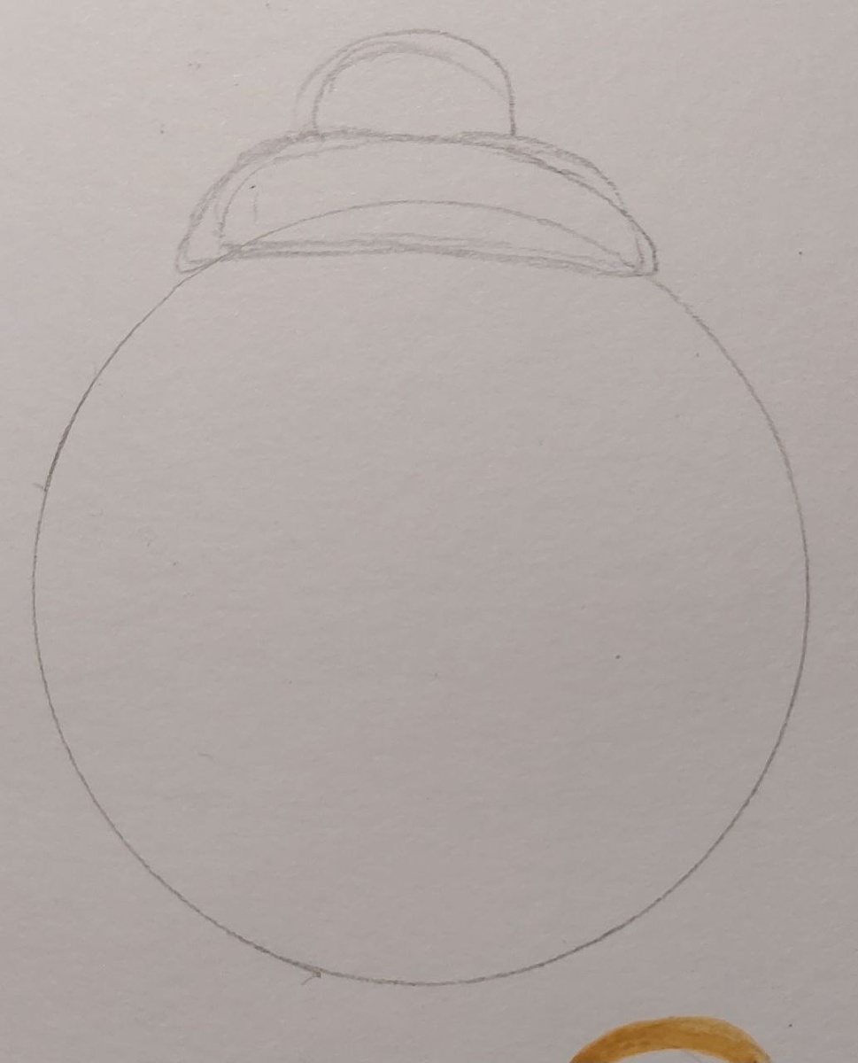 Нарисуем небольшую открытку в новогодней тематике. Основу композиции будет составлять елочный шарик, выполненный в оригинальном стиле. Он не будет иметь четких границ, его облик будет формироваться и композиции листочков и веточек. 1. Для наброска нарисуем круг и верхнюю фурнитуру шарика, за счёт которой он крепится к ветке ёлочки. 2. Внутреннюю часть шарика заполним веточками так, чтобы вырисовывалось очертание округлой формы. Границы круга аккуратно стираем. 3. Темно зеленым цветом рисуем листики на первой (самой левой) веточке кисточкой размером 00. 4. Тоже самое делаем с центральной веточкой. 5. Повторяем действия 3 и 4 пунктов с крайней, последней (самой правой) веточкой. 6. Темно коричневым цветом рисуем веточки. 7. Пустое пространство между листиками заполним нарисованными листочками цветом, который получим при смешивании темного зеленого и небольшого количества синего. 8. Охрой нарисуем фурнитуру шарика и … работа готова! О том как рисовать другие шары: https://dzen.ru/a/Z1xS