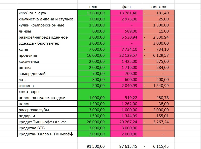 Итак, наконец-то я готова выложить итоги четвертой недели трат и проанализировать в целом расходы за ноябрь. Напоминаю, что на ноябрь по плану распределила 91.500 рублей. Более подробно можно посмотреть здесь. Первая неделя трат здесь, вторая тут, третья здесь. Четвертая неделя вышла затратной, как и первая. Кредиты и кредитные карты – 18 342,24 р. Сюда ушло больше всего. Внесла два платежа по кредитам на сумму 15 тысяч, 3.000 кинула в досрочное погашение (это был доход с продажи на Авито бокса Локситан). Рассрочка за зубы - удалось закинуть только 1000р. Налог за квартиру - 1262р и в жкх - 200р (оплатила через Альфа-банк, за это мне дали 5% кешбека на ЖКХ в декабре!) Аптека - 495 руб Гигиена - 756 руб (6 дезодорантов по акции) и хозтовары - 409,22р (фикс прайс, плюс потратила полученные по промокоду 100 баллов) На разное ушло 1377,03р. Это 5 поездок на транспорте, когда основной проездной был у мужа, стельки, подписка на сервисы и ещё что-то мужу покупала. На котов снова пришлось рас