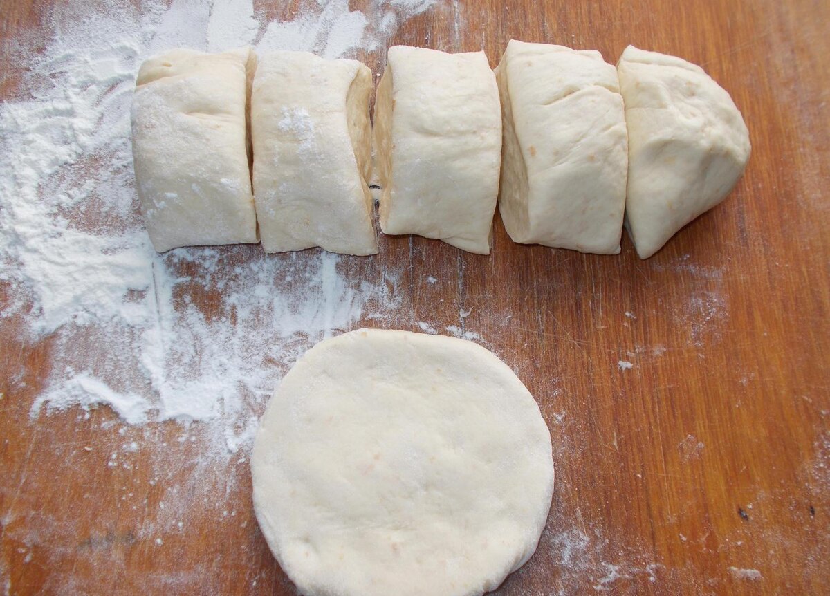 5. Тесто выложите на рабочую поверхность, сформируйте из него колбаску и разрежьте на несколько частей.