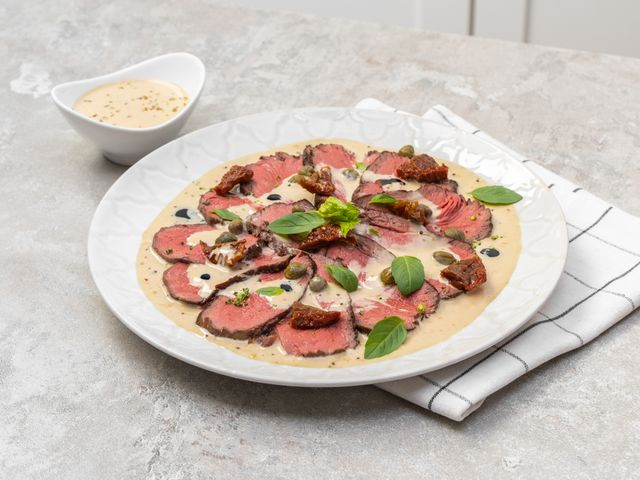 Количество порций: 4-6 Вителло тоннато — это классическое итальянское блюдо из холодного отварного телячьего мяса с соусом на основе тунца. Этот деликатес идеально подходит для теплого летнего обеда или ужина, поскольку подается охлажденным и имеет насыщенный вкус с лёгким ароматом морепродуктов и свежести лимона. Вителло Тоннато — это изысканное и освежающее блюдо, которое подойдет как для праздничного стола, так и для летнего пикника. Благодаря сочетанию нежного телячьего мяса с пикантным соусом из тунца и анчоусов, это блюдо нравится даже тем, кто не слишком жалует рыбу. Котлеты по министерски из куриного филе Рецепт классических драников Топ-5 кулинарных лайфхаков Новая неделя – новое меню! 60 блюд на выбор. Успейте заказать всё самое вкусное в Шефмаркет❤ Нравятся наши статьи? Ищите вкусные и полезные идеи на chefmarket.ru Не забудьте поставить лайк, если Вам понравился наш рецепт:)