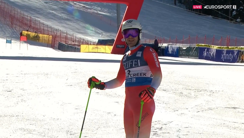 Лео Ангено из Франции тоже впервые стартует в Бивер-Крике. Француз немного нервно проходит первые отрезки, проигрывает 53 сотых, затем 57 сотых. Может попасть в тройку лучших. Да, Лео финиширует вторым, +0.86. Его, конечно, еще отодвинут, но в топ-15 он скорее всего попадет. И он доволен.