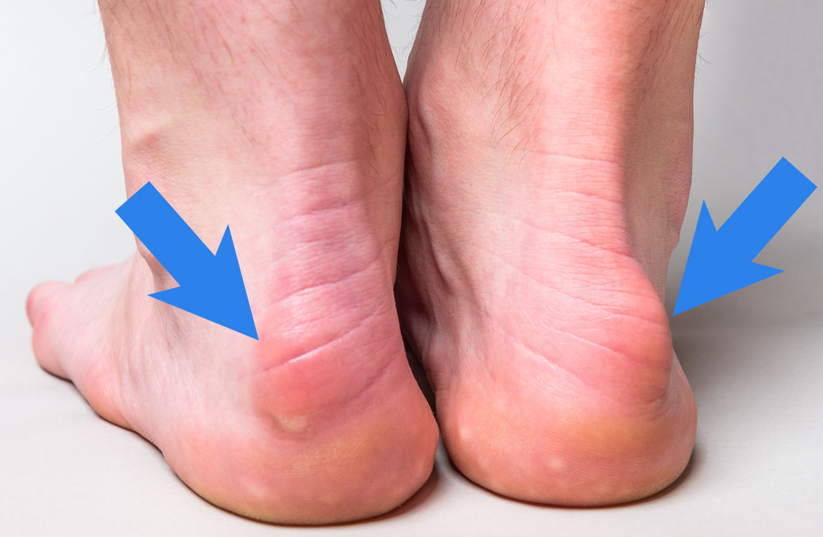 - Шишка на задней поверхности пятки, которая может быть твёрдой или болезненной при пальпации.
