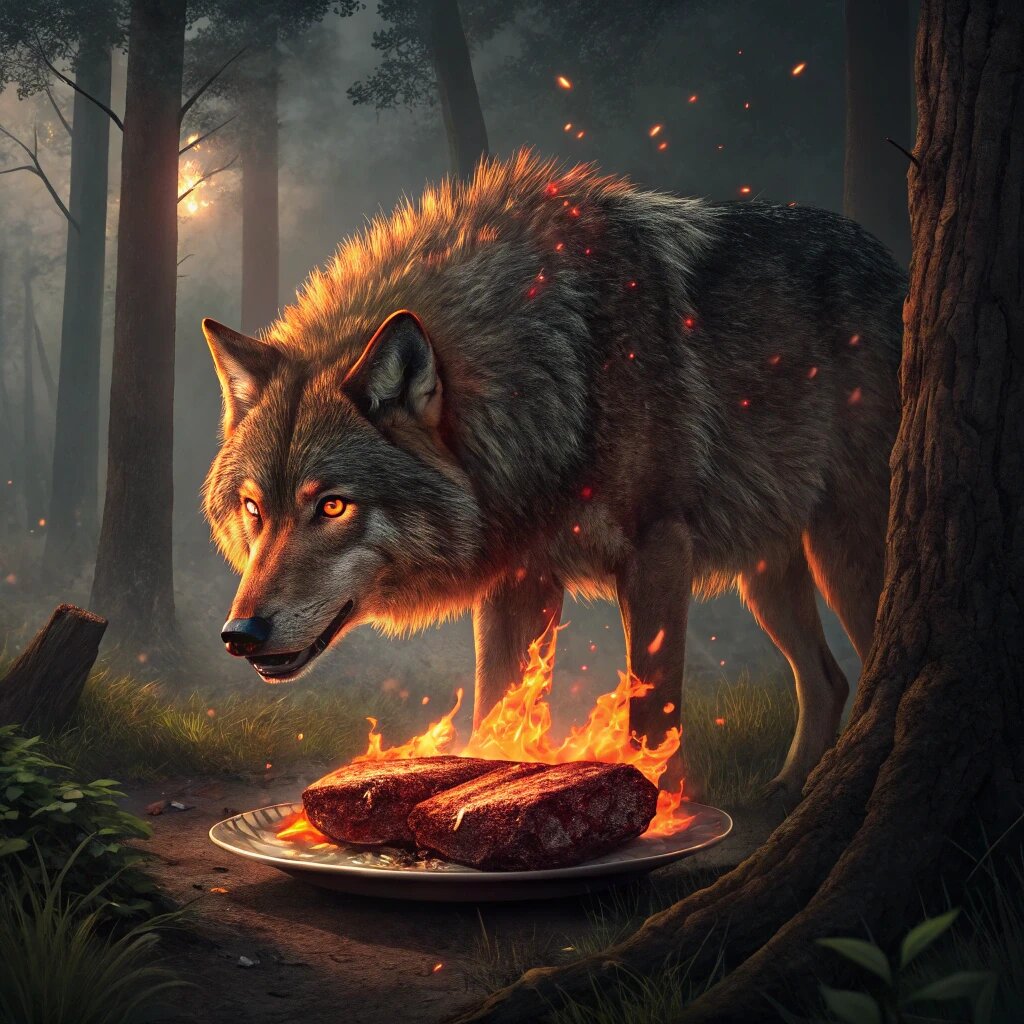 Вся лесная чаща была готова к их маленькому празднику: вечернему приготовлению стейка на мангале. Этот особый момент собрал их вместе, словно заколдованный магией охоты и дружбы. Но не только природа завела их в эту глухую чащу. Оба знали, что за этим ритуалом, каким-то образом, стояла загадочная сила леса, великая и таинственная — Хранитель Вкусов, по имени — Огненный Волк. Легенды о нем переплетались с рассказами о предках, говорили, что он появляется только в минуты истинного вдохновения и созидания.
