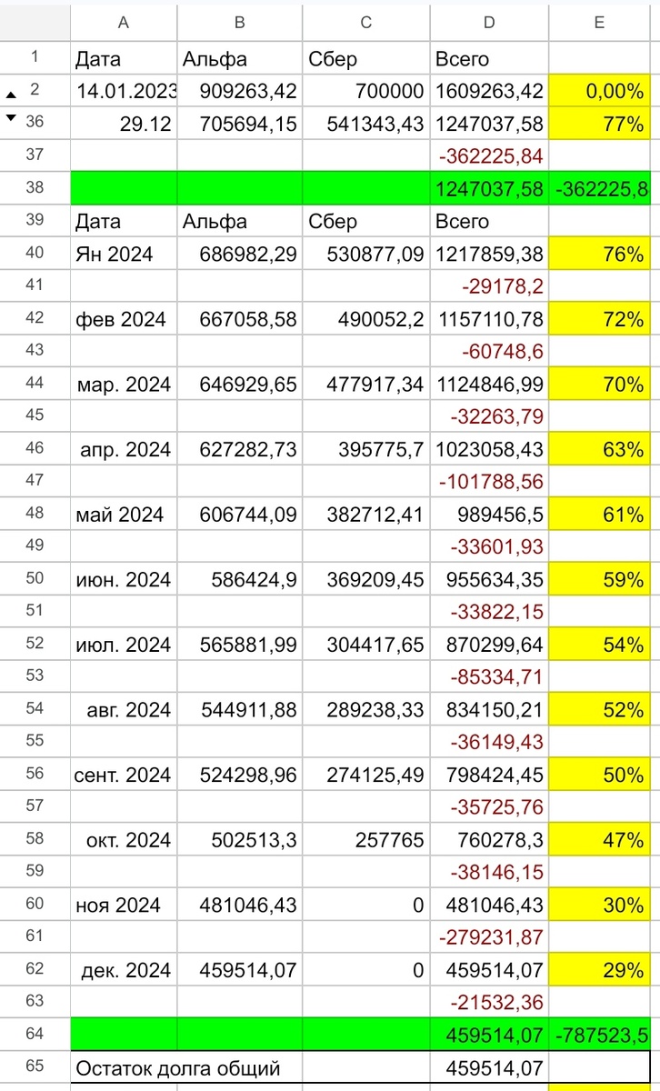 Остаток долга на конец 2024 года - 459514 рублей. Осталось 29% от общей суммы, что была 2 года назад.
