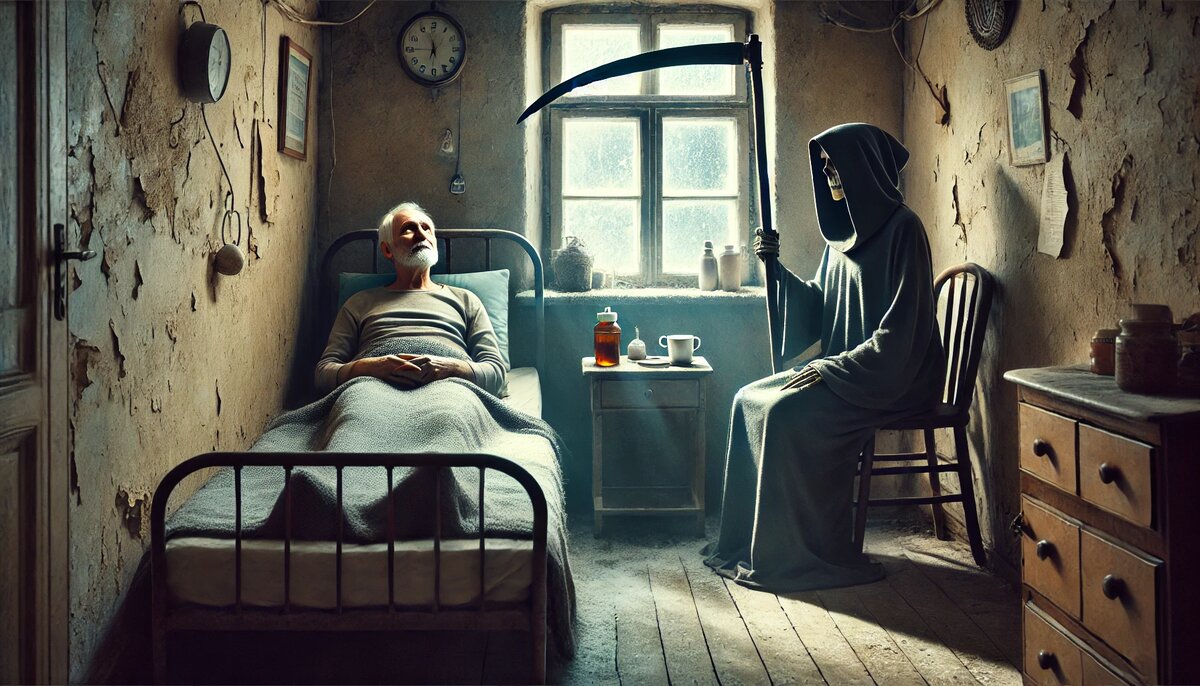 Антон Иванович лежал на своей скрипучей кровати, зажатой между облупившейся стеной и тумбочкой, уставленной лекарствами, как прилавок аптеки перед праздниками. Ночь была тихой, за окном шуршал поздний снег, и крохотная лампочка над головой излучала жалкий жёлтый свет. Антон Иванович чувствовал, что скоро ему придётся распрощаться с этим миром. Годы службы в школе дали о себе знать: сердце барахлило, ноги не слушались, память подводила. Но страха не было, лишь странная усталость. И тут в тишине комнаты появилась она — Смерть. Не театральная с косой и чёрным плащом, а вполне будничная, но всё же узнаваемая: высокая, в каком-то сером жакете, с косой за спиной (куда ж без неё), и глазами, в которых плескалась пугающая пустота. Она тихо села на край кровати, глянула на тумбочку: таблетки, мази, полчашки остывшего чая, забытая книга с закладкой. Всё стандартно, как на экзамене у больных жизнью стариков. — Пришла всё-таки? — спросил Антон Иванович, хрипловато усмехнувшись. — Угу, — кивнула См