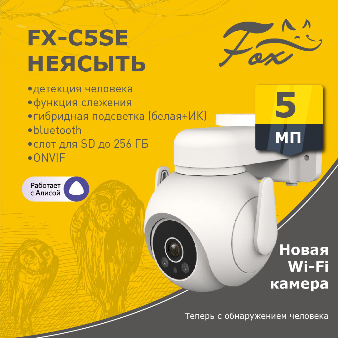 Мы уже анонсировали новинки Wi-Fi и 4G камер FOX, давайте теперь рассмотрим эти модели поближе. Уличная поворотная 5 Мп Wi-Fi камера FX-C5SE НЕЯСЫТЬ Среди главных отличий от предыдущих 3 Мп моделей в Wi-Fi линейке – НЕЯСЫТЬ теперь умеет не только фиксировать движение, но и детектировать фигуру человека, что существенно снижает количество ложных тревог. В дополнение к этой аналитике камера имеет функцию слежения за движущимся объектом, что позволит контролировать движение объекта, пока он находится в зоне видимости камеры. Кстати о видимости: НЕЯСЫТЬ оборудована объективом 4 мм, что дает ей более узкий угол обзора по сравнению с 2.8 мм моделями - 98°. Зато с помощью поворотного модуля камера может охватывать область вокруг себя на 360°. Также полезная опция: гибридная подсветка. Настроить переключение между режимами белой и ИК-подсветки можно по движению – при таком сценарии белая подсветка будет загораться при обнаружении события, а в остальное время камера будет вести съемку в ч/б-реж