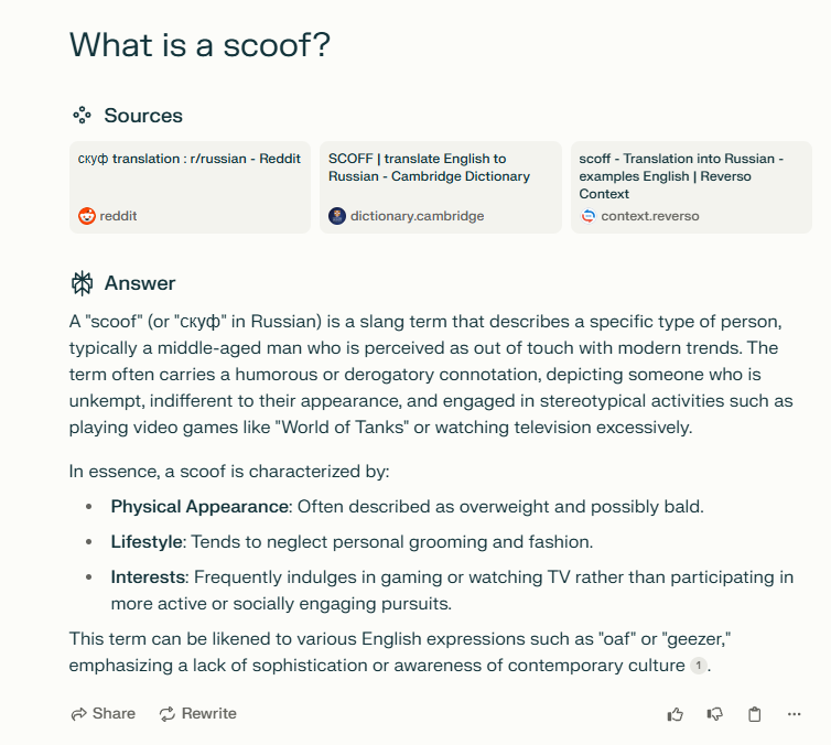 А другой забавный факт в том, что англоязычная нейросеть Perplexity (перплексити) гораздо подробнее описывает, кто такой скуф: