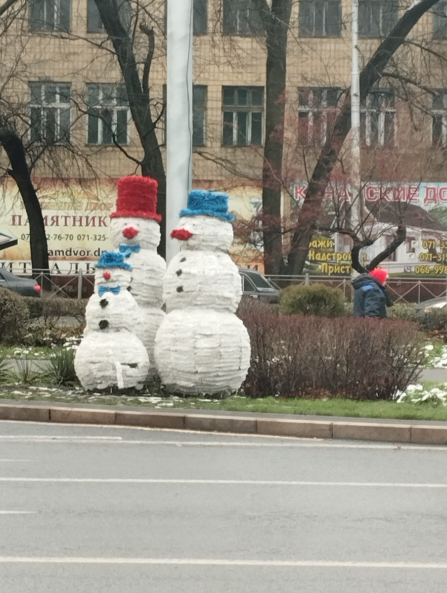 На перекрёстке с также ещё в прошлом году реконструированным участком бульвара Шахтостроителей пожилая женщина долго внимательно рассматривает недавно высаженные крымские сосны, а потом и троицу грустных в этот пасмурный и слякотный день нашей обычной донецкой зимы снеговиков. Ей явно хочется поделиться хоть с кем-нибудь своими впечатлениями: