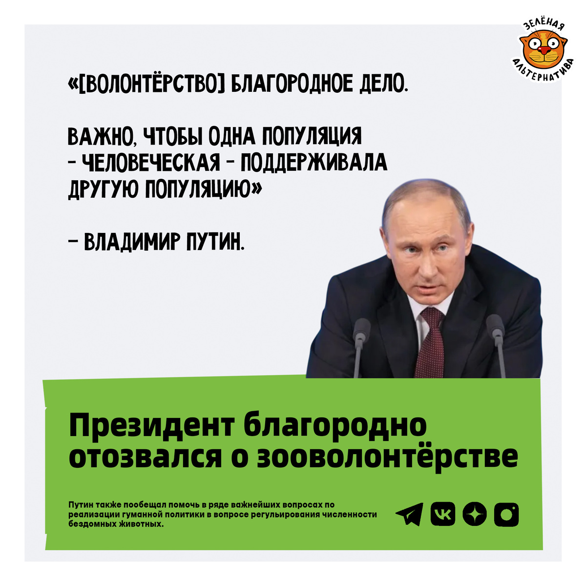Владимир Путин на встрече добровольцами на форуме гражданского участия «Мы вместе» поддержал их работу по спасению животных из опасных территорий и отправке гуманитарных грузов в приграничные зооприюты. Глава государства пообещал помочь в вопросе выделения земель для строительства новых приютов для животных, а также создания спеццентра по решению проблем домашних и бездомных четвероногих. Это сигнал Кучугурову, Дунаеву и всем остальным лоббистам региональных законов по эвтаназии четвероногих. «[Волонтёрство] Благородное дело. Важно, чтобы одна популяция – человеческая – поддерживала другую популяцию», — сказан Путин в ответ на рассказ зоозащитницы и руководителя БФ «НИКА» Веры Митиной о помощи домашним и бездомным животным на новых территориях, а также строительства многочисленных шелтеров для братьев меньших. В подтверждение позиции президента существует целое поручение президента (ПР-808) по формированию в обществе ответственного отношения к животным. Однако на вместо гуманности у на