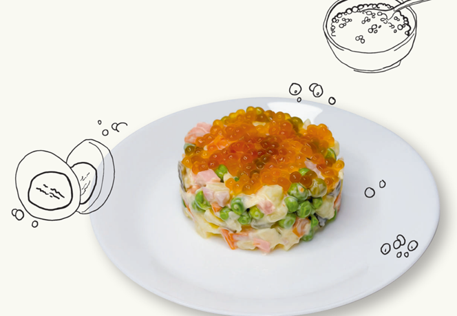 Кто не готовил тазики оливье на Новый год? Кто-то готовит его с говядиной, кто-то — с вареной колбасой или ветчиной, но, в любом случае, вкус этого салата многим уже надоел. Но у дяди Кости всегда найдется какое-то новое интересное решение! Так что мы приготовим совсем непривычный и необычный оливье с копченой семгой, а заодно и узнаем, как правильно и вкусно закоптить рыбу в домашних условиях да так, что будет не отличить от той самой, приготовленной на коптильне! Тебе понадобятся (на одну порцию): Картофель — 50 г; Морковь — 20 г; Зеленый горошек свежемороженый — 10 г; Яйцо куриное — 1 шт; Майонез — 50 г соленые; Бочковые огурцы — 30 г; Хрен сливочный — 15 г; Красная икра — 10 г; Копченая семга — 100 г. Как готовить: 1. Отвариваем картофель, морковь, яйца; остужаем и чистим. 2. Нарезаем все эталонно по размеру зеленого горошка. 3. Горошек обдаем кипятком и сразу охлаждаем (чтобы не потерял свой цвет). 4. Огурцы нарезаем кубиком и откидываем на сито. 5. Для приготовления копченой семг