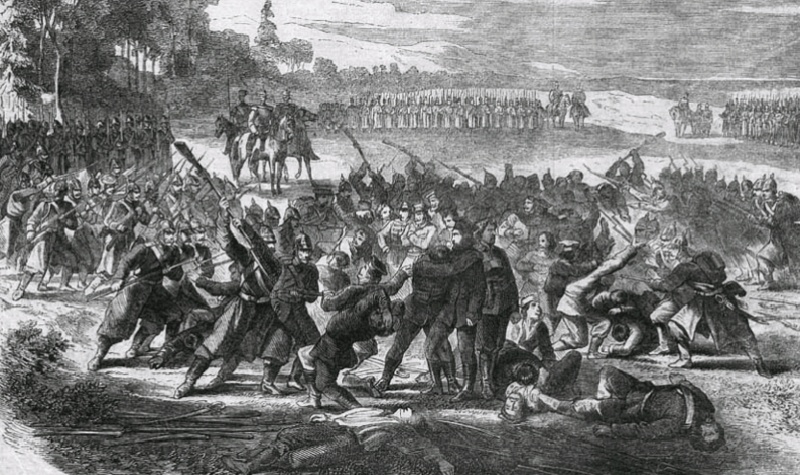 Шел 1863 года. Поляки в очередной раз подняли восстание, пытаясь избавиться от покровительства России. В начале июня близ селения Лютов сосредоточился отряд мятежников под командованием полковника Антония Коротынского. Под его командованием собралось порядка 500 человек. 14 июня из города Велюнь, для разгрома мятежников, была выдвинута часть подразделений Белозерского пехотного полка под командованием полковника Померанцева, общей численностью 200 человек. Кроме того, из города Калишь, навстречу Померанцеву, вышел сводный отряд полковника Тарасенкова. Сводный отряд состоял из трем пехотных рот, эскадрона казаков и 4 орудий. Утром 15 июня отряд Померанцева вышел на лагерь мятежников, расположенный в лесу севернее города Лютутов. Полковник Кортынский, оценив силу противника, приказал отступать на юг к Лютутову. Но неожиданно он обнаружил, что путь к городу перекрыт вторым русским отрядом. В таких условиях он вынужден был разделить свой отряд на две части. Первая часть, в которую вошли
