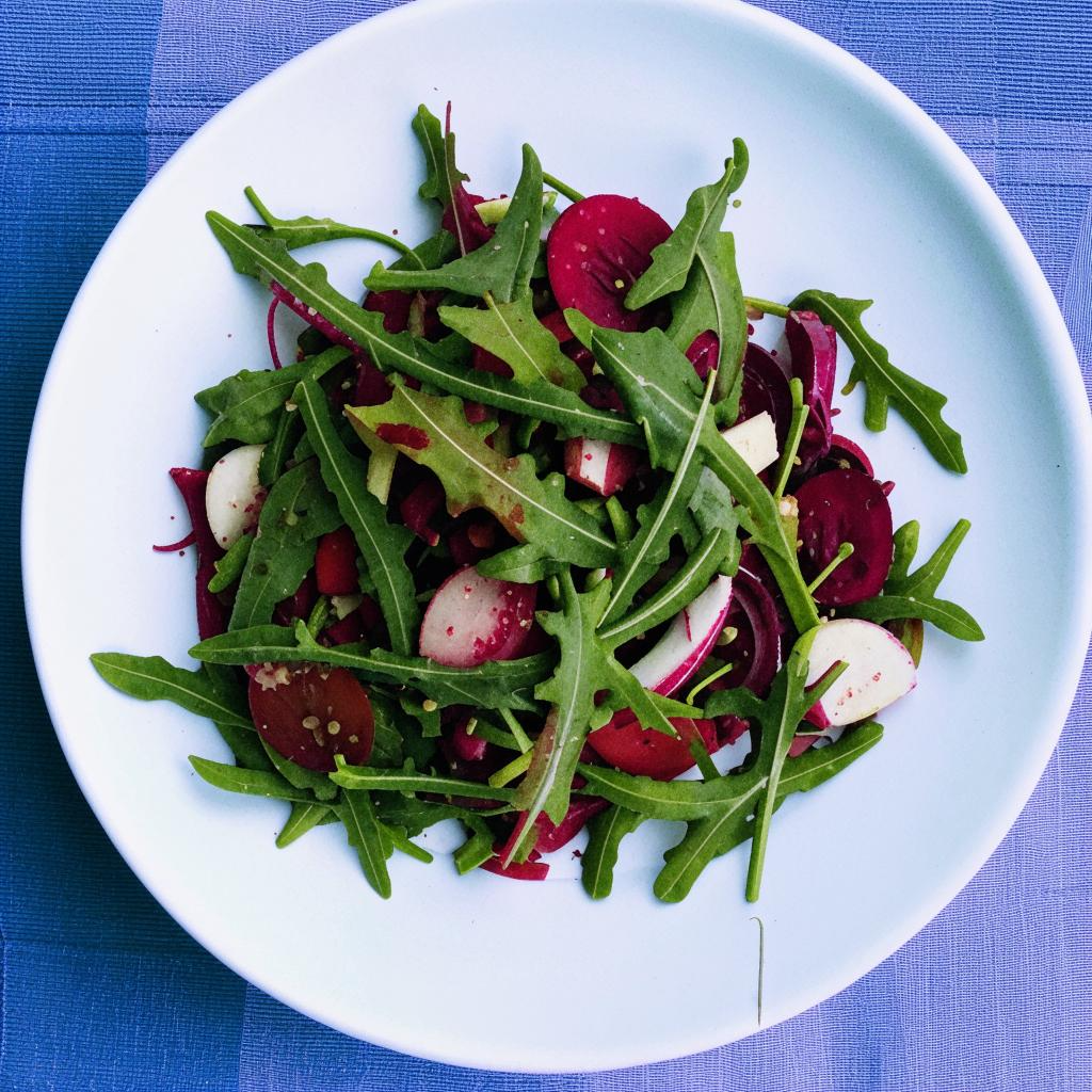 Салат из руколы и радиччо с подогретой заправкой.