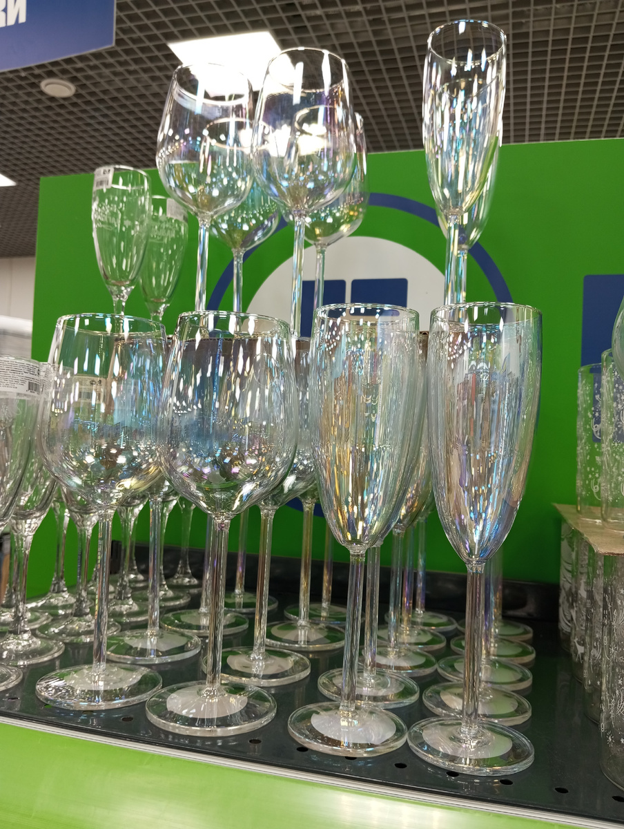 В преддверии Нового года Фикс-прайс выпустил целую серию товаров переливающихся всеми цветами радуги - перламутровые бокалы, кружки, салатники, банки и даже тряпки для уборки. Заходишь в магазин и вокруг всё сверкает и блестит. Красота! ✨😁 Конечно, в повседневной жизни такая посуда скорее на любителя, но для праздника, мне кажется, интересный ход. Давайте вместе посмотрим, что из новой коллекции есть сейчас в продаже и сколько стоит. Более широкие бокалы (на фото слева) предназначены для вина. Объем 440 мл. Цена 299 руб. Узкие бокалы - для шампанского (справа). Объем 230 мл. Цена 279 руб. И те, и другие изготовлены из боросиликатного стекла. Производство Китай. Стаканы также из боросиликатного стекла. Высокий стакан (230 мл) - 83 руб. Низкий стакан (250 мл) - 83 руб. Стопка (50 мл) - 35,50 руб. Симпатичная фарфоровая кружечка с оленями. Объем 335 мл. Цена 149 руб. Кухонные принадлежности в данной коллекции получили необычные сверкающие ручки. Для всех кухонных принадлежностей - прои
