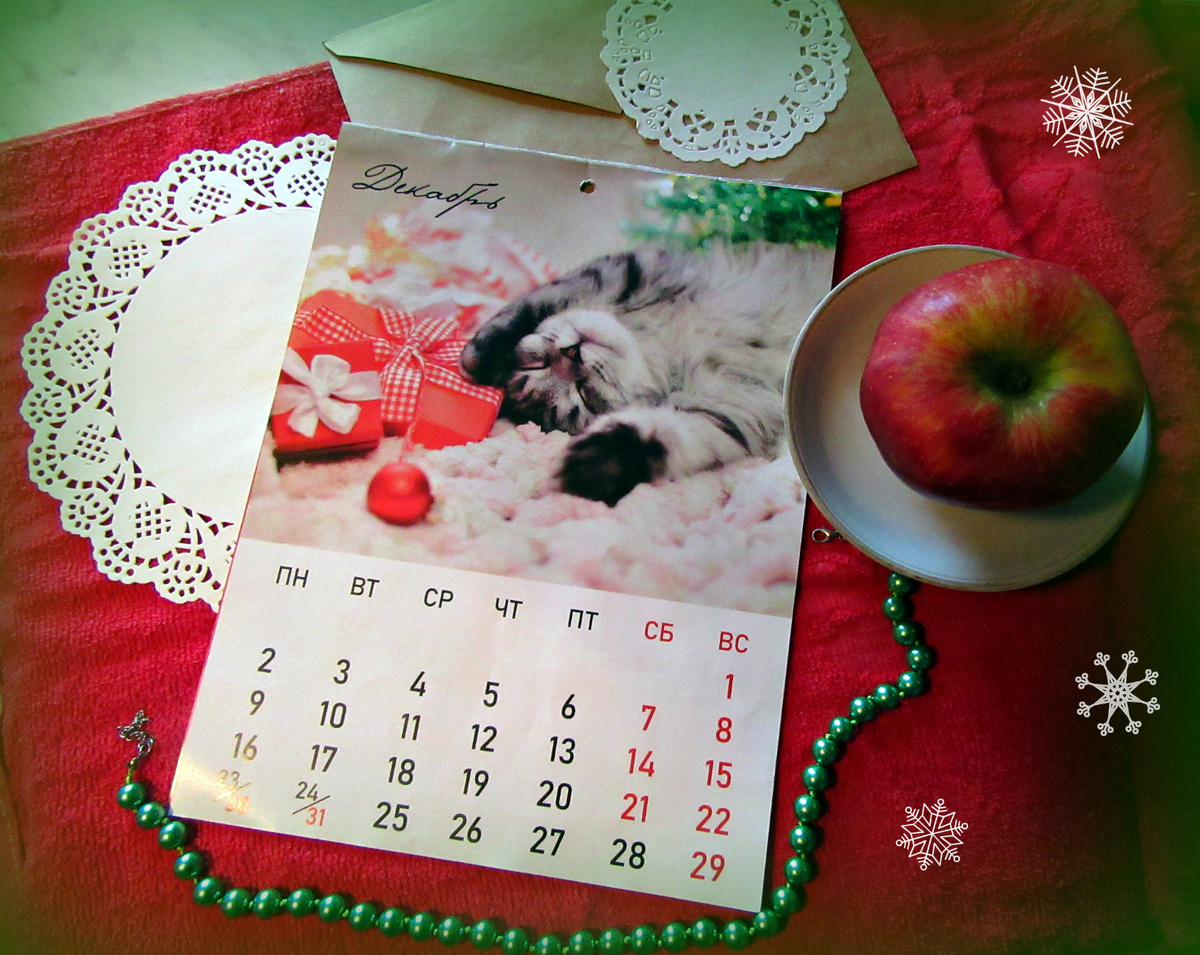 Здравствуйте, друзья-читатели! Нет, я не начинаю зимний фотомарафон, не потяну его. А вот за день сегодня что-то немножко набралось, и этим "чем-то" готова поделиться прямо сейчас)) Традиционная композиция с календарём. И столь же традиционные для декабря и всего новогодья цвета - красный, зелёный, белый... А дальше просто картинки из окна и с прогулки. Начнём с утра. Выдалось несколько морозных дней (у нас до -27°), и по утрам небо играло красками... Сегодня погода переломилась на оттепель, но с утра ещё было морозно. Потом облака стали плотнее... А во второй половине дня, когда более-менее потеплело, мы немного погуляли по селу. Фотографировать сейчас особо нечего. Разве что графический узор ветвей на фоне неба... Или вот такое расположение домов - ярусами, друг над другом. Заснеженная макушка Лысой горы. Сосны слегка тронуты инеем, а лиственницы сбросили хвою и выглядят на фоне снега как некий штрих-код)) И на финал - солнышко, спешащее уйти за горизонт. Зимний день короток... Спаси