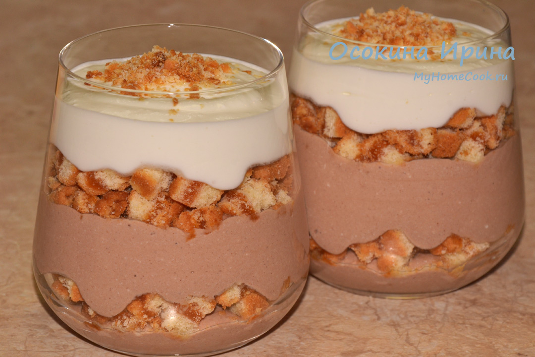 В миске смешала 1 стакан с верхом сметаны с 2 ст.л. какао и 2 ст.л. коричневого сахара, промешала и оставила на 20 минут, чтобы сахар растворился, после чего снова промешала. Порезала кубиком 150 г сдобного печенья с прослойкой из абрикосового джема. В другой миске смешала 2/3 стакана сметаны с 1 ст.л. с верхом сахарной пудры и промешала до однородности. В сервировочные бокалы на дно уложила по 1 ст.л. сметаны с какао, разложила половину порезанного печенья, поверх выложила всю сметану с какао, на неё - оставшееся печенье, укрыла всё сметаной с пудрой, украсила крошками от печенья, настояла немного в холодильнике и подала. Ооочень вкусно и сытненько! Хотите десерт, хотите завтрак или перекус) Приятного аппетита