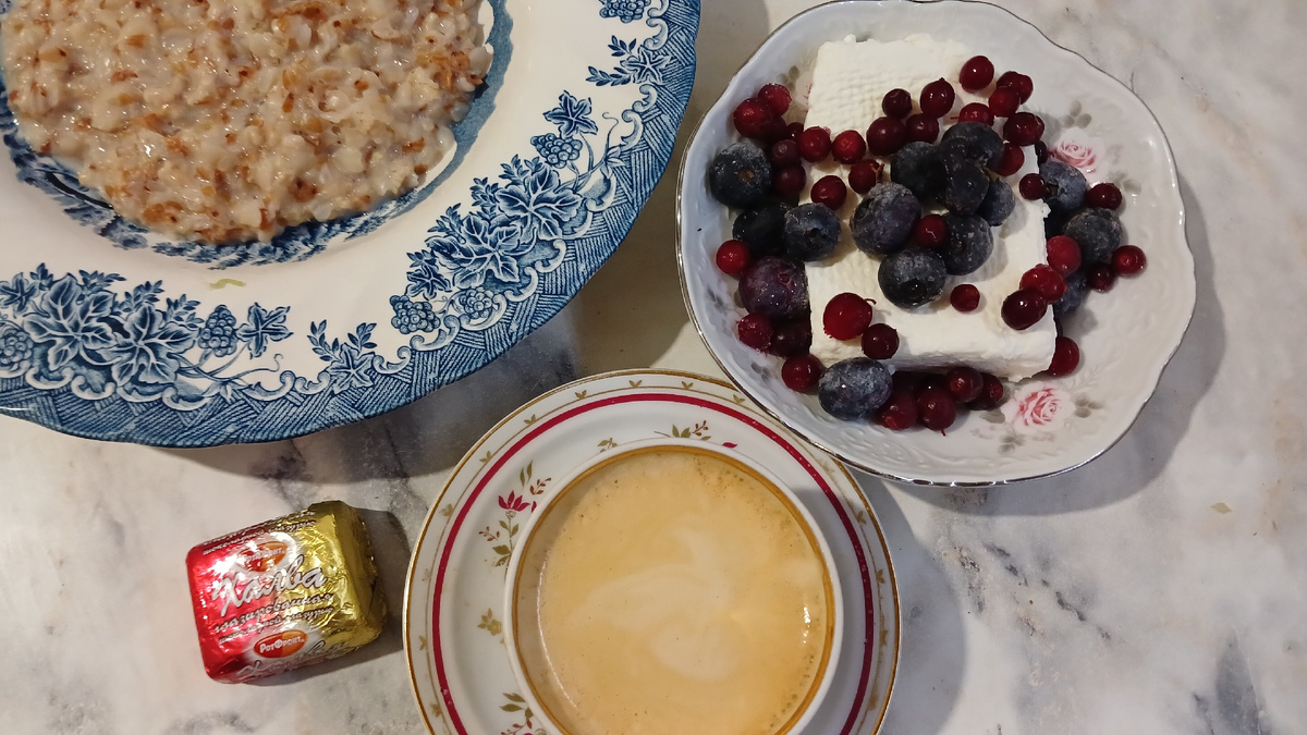 Завтракаем сегодня кашей и творогом. Каша овсяно-гречневая, творог пластовой Вкусвилл, к творогу добавила ягоды - голубику и бруснику. А к кофе - халва в шоколаде На обед сварила рыбный суп из форели. Суп варила без картошки, в составе морковь, пшено, зеленый горошек, укроп и форель. К супу бутерброды с копченой горбушей. Такой рыбно-рыбный обед на десерт - чашка кофе, мандарин, сыр камамбер с трюфелем и чак-чак, и это все под хороший сериальчик 😊Маленькая перезагрузка😇 На ужин приготовила блюдо греческой кухни лоханоризо. А по-нашему - тушеная капуста с рисом. Оно намного сытнее, чем обычная капуста. Часто его в пост готовила раньше. К лоханоризо -котлетки, фарш свинина+курица домашний Все готовила в одной утятнице: потушила капусту с рисом, за 20 минут до готовности выложила шарики котлеток, они получились как паровые. Полностью диетическая еда. Лоханоризо нам на завтра еще осталось. Меню год назад