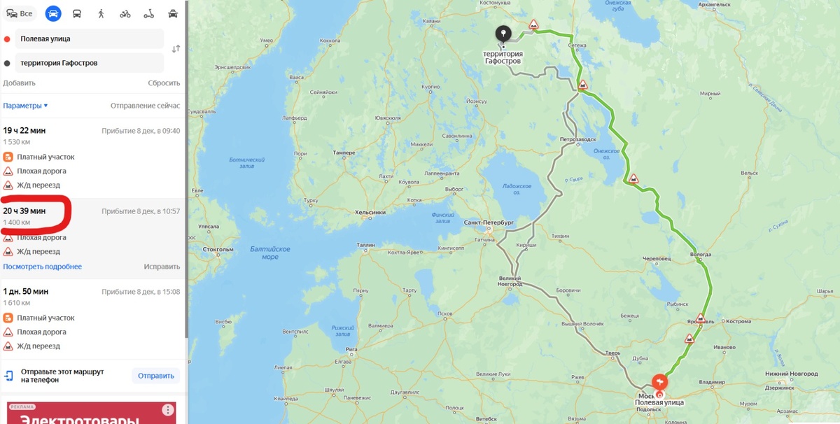 От Москвы до Карелии есть 2 пути: через Великий Новгород (трасса М11) и через Вологду (трасса М8). Путь через Вологду немного короче (на 130 км), но, несмотря на это, по прогнозу навигатора, займет на 1 час и 17 минут дольше времени: