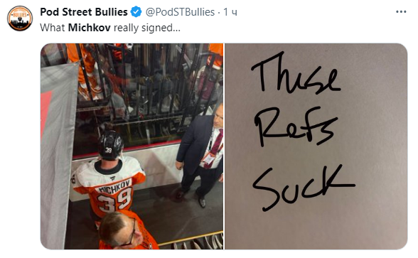 Матвей Мичков дал автограф поклоннику, покидая площадку после удаления в концовке игры «Флайерз» – «Юта» (2:4). За 17 секунд до финальной сирены нападающий «Филадельфии» получил 12 минут штрафа (малый плюс дисциплинарный) за стычку с форвардом Барретом Хэйтоном и, вероятно, за попытку выбить свисток у судьи. Посмотреть видео Мемы появились моментально: Данное действо, пришедшееся на день рождения Матвея – ему исполнилось 20 лет, активно обсуждалось североамериканскими любителями хоккея в социальной сети X: @alexwalsh6:- Дайте ему капитанскую повязку. @Murraypalooza:- Номинант на звание «Спортивный момент года в Филадельфии», ха-ха. @phlyershockey:- Это было так смешно, что вся толпа одобрительно загудела. @8kimchikillah8:- Человек из народа, ха-ха! @MikeWal83297257:- Он настоящий филадельфиец. Нам повезло, что мы его заполучили. @orangeandblackk:- Он очень сильно разозлит Тортса, но мне подобный поступок по душе. @mash2k22:- Поведение рок-звезды! @tonyescargot:- Я боюсь за безопасность