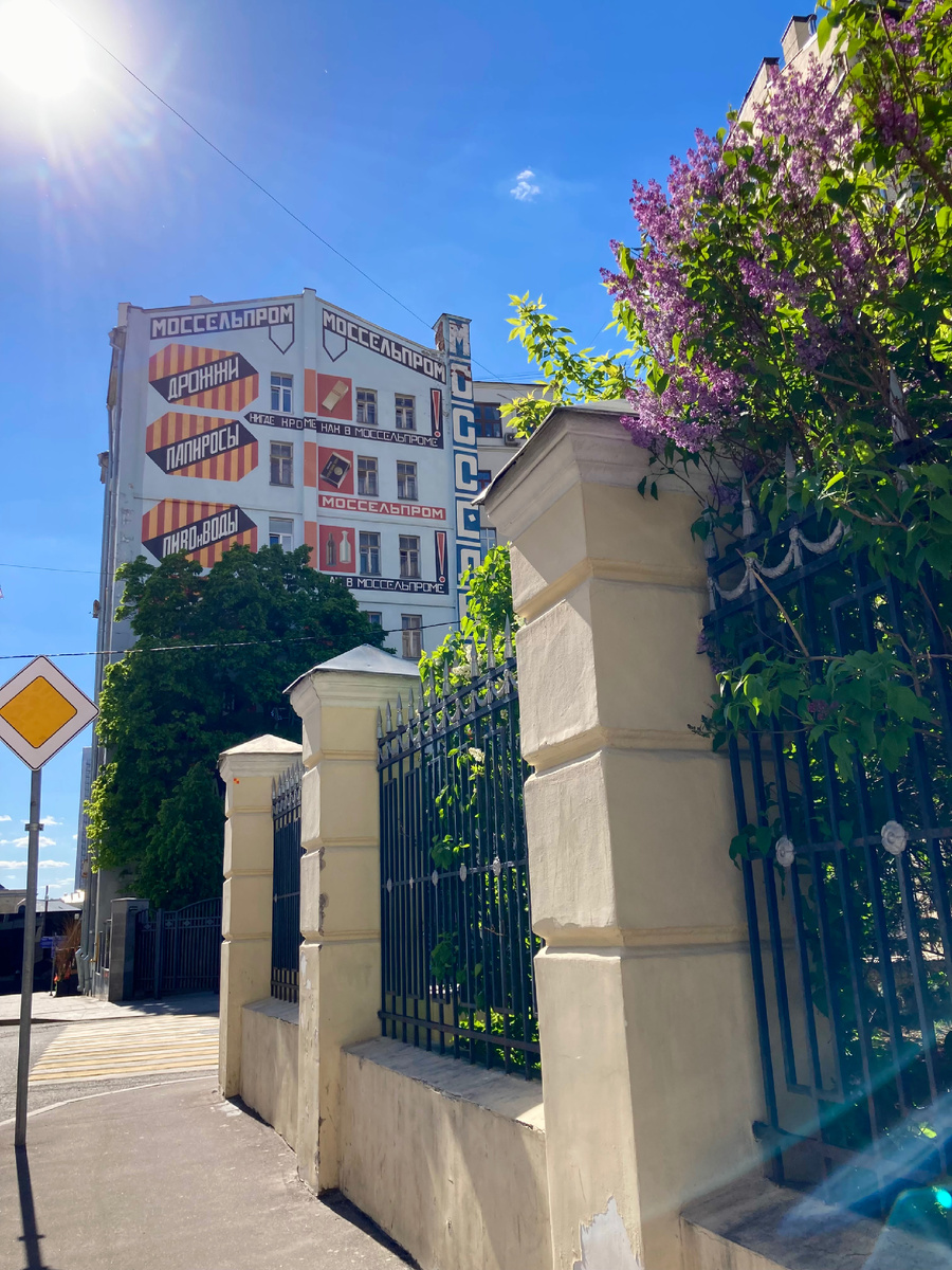 Но настоящую известность дому «Моссельпрома» принесла другая работа Родченко - огромное панно прямо на неоштукатуренной стене, созданное художником совместно с его супругой Варварой Степановой. Торец здания со стороны Малого Кисловского переулка украсили изображения конфеты «Мишка косолапый», молока и пива «Друг желудка», а также папирос «Герцеговина Флор». Слоган «Нигде кроме, как в Моссельпроме» придуман Владимиром Маяковским. Несмотря на то, что в здании располагались склады и офисы пищевого треста, часть помещений была отдана под жилье сотрудников кондитерской фабрики Абрикосовых (нынешний концерн «Бабаевский»).