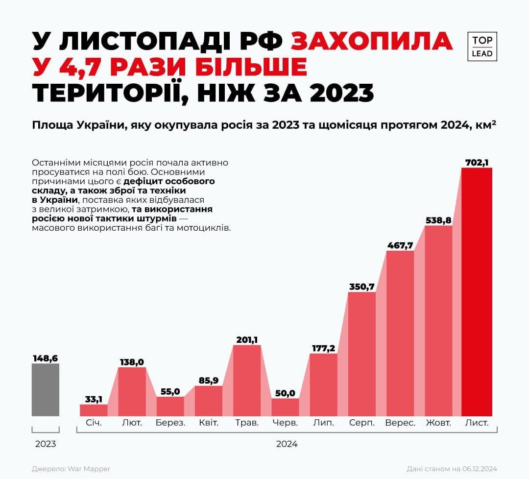 Сегодня появилась инфографика (причём, с той стороны), где чётко видно, как последовательно наши усилия выливаются в результат, в данном случае территориальные приобретения. На этой диаграмме показан график освобождения нами территории. Получается так, что за ноябрь нам удалось отбить почти в 5 раз больше, чем за весь 2023 год и сейчас нет причин сомневаться в том, что темп, по самым скромным прикидкам, нам вполне реально сохранить, а, по оптимистичным прогнозам, ещё и нарастить кратно. Данные цифры – наглядная демонстрация того, что с той стороны происходит истощение сил. Мы же наращиваем свои усилия. Конечно, и у наших хватает проблем, но при всём при этом идёт постепенное движение вперёд. Это видят и их западные партнёры, поэтому и настаивают на снижении возраста до 18 лет. Мы уже говорили, что это им в краткосрочной перспективе может помочь нас притормозить, но радикально ничего не изменит. Тут стоит ещё заметить, что такое наше продвижение обуславливается еще и тем, что у той стор