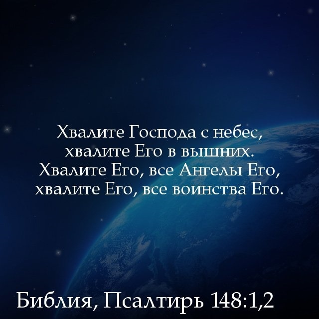 “Хвалите Господа с небес, хвалите Его в вышних. Хвалите Его, все ангелы Его, хвалите Его, все воинства Его. Хвалите Его, солнце и луна, хвалите Его, все звезды света. Хвалите Его, небеса небес и воды, которые превыше небес. Да хвалят имя Господа, ибо Он повелел — и сотворились; поставил их на веки вечные; дал устав, который не прейдет” (ст. 1-6).