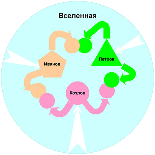 три персонажа на рисунке по разному отражают Вселенную в своём сознании и при этом каждый не представляет, что видят остальные...