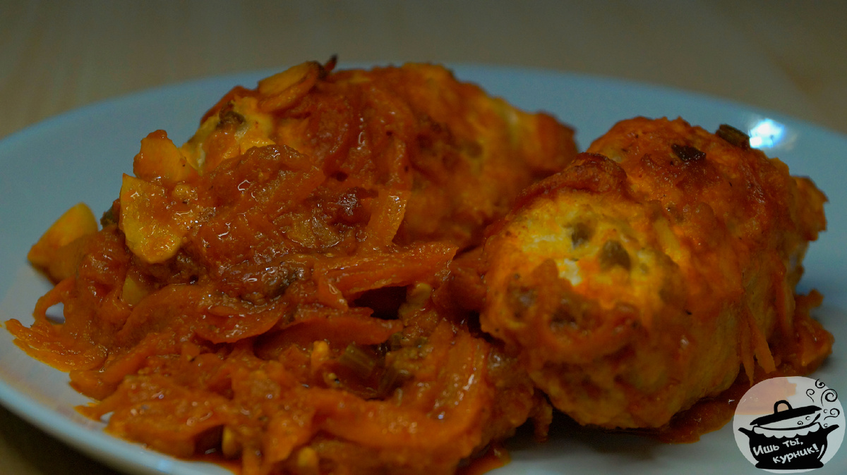 Ингредиенты: · фарш – 500 гр.; · яйцо – 1 шт.; · лук – 1 шт.; · гречка варёная – 5 ст.л.; · морковь – 2 шт.; · укроп – 3 веточки; · сок томатный – 2 ст.; · соль – ¼ ч.л.; · сахар – ¼ ч.л.; · мука для обваливания; · масло для жарки. Приготовление: лук пропустить через мясорубку или перебить блендером. Гречку, лук, фарш и яйцо смешать в однородную массу. Морковь потереть на тёрке, обжарить в сковороде, которую можно поставить в духовку. К моркови добавить рубленую зелень, соль, сахар, томатный сок, дать прогреться. Сформировать из фарша тефтели размером с яйцо, обвалять в муке, поместить в соус. Сковороду поставить в предварительно разогретую духовку на 30 минут при 180°С, периодически поливать тефтели соусом. Приятного аппетита! Примечание: если блюдо готовится для детей старшего возраста или для взрослых, в соус можно положить 3 рубленых зубчика чеснока, ½ ч.л. чёрного молотого перца.