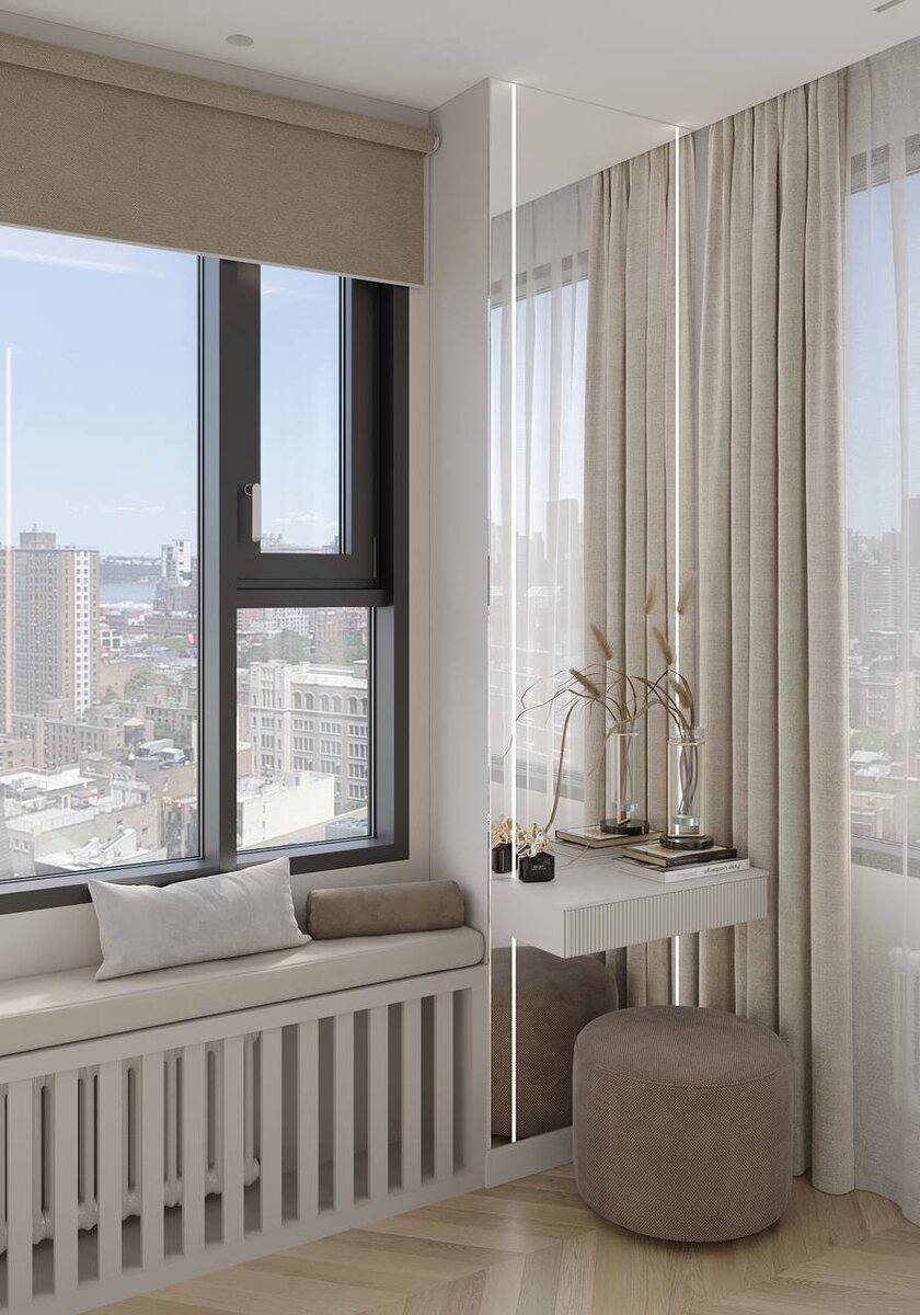 Использование стены у окна окна — отличный способ сделать маленькое пространство более функциональными. Задействуйте каждый метр площади. Превратите бесполезную вертикаль в зону для отдыха, общения или спорта. Сделайте подоконник прочным и достаточно широким, чтобы превратить его в уютное место для отдыха. Сверху постелите мягкий матрас для комфорта. Декоративные подушки завершат композицию. Под сиденьем можно разместить корзины или выдвижные ящики для хранения мелочей. Рассчитайте точную стоимость под ваш бюджет в нашем калькуляторе на сайте https://gkpokolenie.ru/remont Лайфхак: если батарея мешает комфорту, замените её на вертикальный радиатор, как на фото в нашем проекте. Барная стойка у окна — идеальное место для утреннего кофе. Закрепите прочную столешницу на высоте около 110 см и добавьте барные стулья. Панорамные окна добавят особый шарм. Лайфхак: встроенная розетка или USB-порт на столешнице — удобное решение для зарядки гаджетов. Сделайте на подоконнике компактный рабочий
