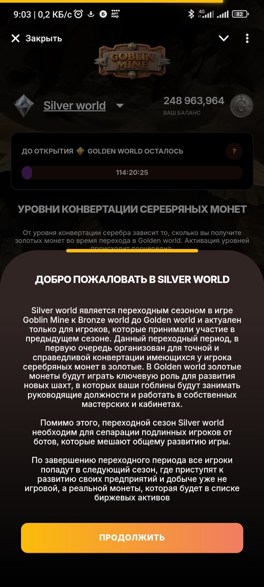 Сегодня в Goblin Mine игроки заметили что привычный вход в игру больше не работает. Разработчики объявили о начале Silver World, промежуточным сезоном между Bronze и Gold World. Что будет во 2 сезоне Гоблин Майн? Вот что в своем ТГ написала команда D36: 🎊 Серебряный мир ждет! Сегодня мы рады объявить о запуске Серебряного мира — перехода между Бронзовым и🪙 Золотые Миры🪙 . В этот уникальный период все гоблины приносят добытое ими серебро⚖️ обменять его на золото, которое необходимо для разработки рудников следующего, Золотого Мира. 👀 Ваши достижения в Бронзовом Мире не останутся незамеченными! Каждый игрок получит заслуженный бонус🎁 в серебре, увеличивая вашу способность торговать золотом. Однако обменные курсы различаются для всех, в зависимости от вашего уровня конвертации. Многие игроки, которые приобрели пакет, содержащий🚀 Silver World Boost теперь автоматически получает лучшие обменные курсы. Не волнуйтесь, если ваш уровень конвертации низкий, вы можете улучшить его, сде