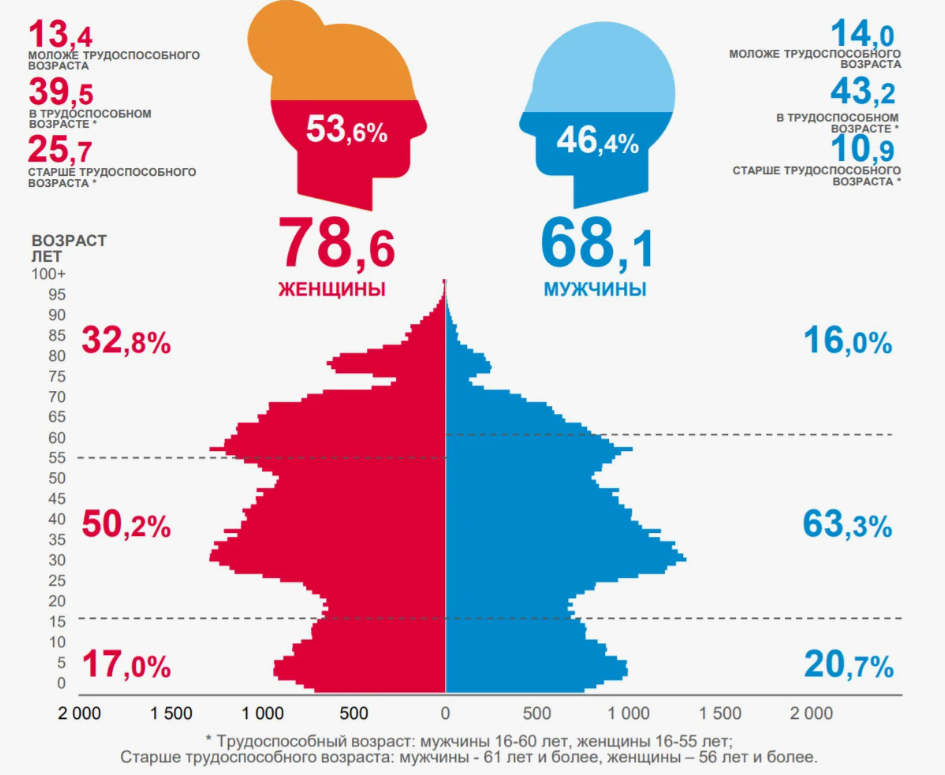 Как видите, в молодежи нетрудоспособного возраста мужчин больше, в трудоспособном возрасте - мужчин больше, а вот страше, там да, мужчин меньше. Это говорит о чем? Что каждая женщина до 55 лет способна найти своего мужчину, на всех хватит, да еще и выбирать может! Женщинам страше может чуть сложнее, но ведь она всегда может себе по-моложе найти😉.