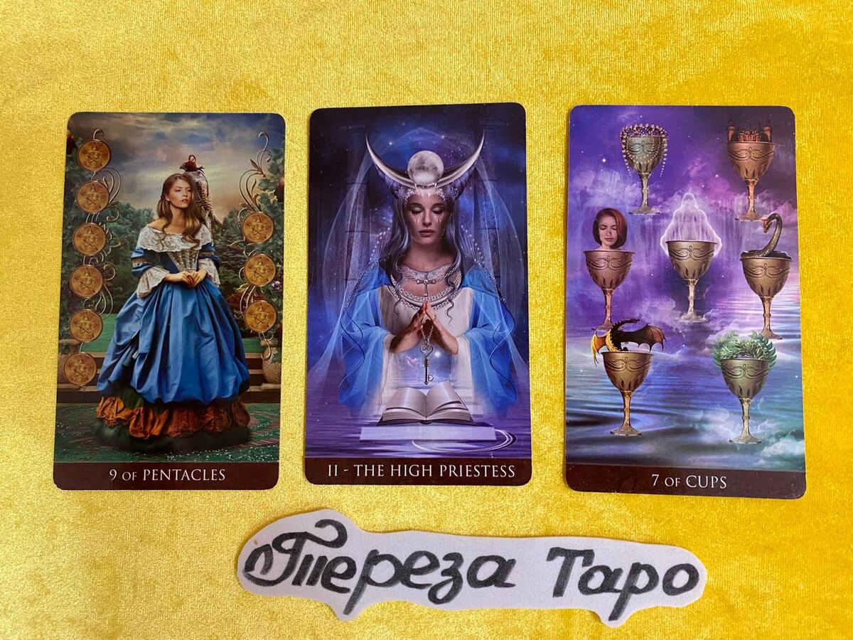 1. Настоящее – 9 Пентаклей, Верховная Жрица, 7 Кубков.