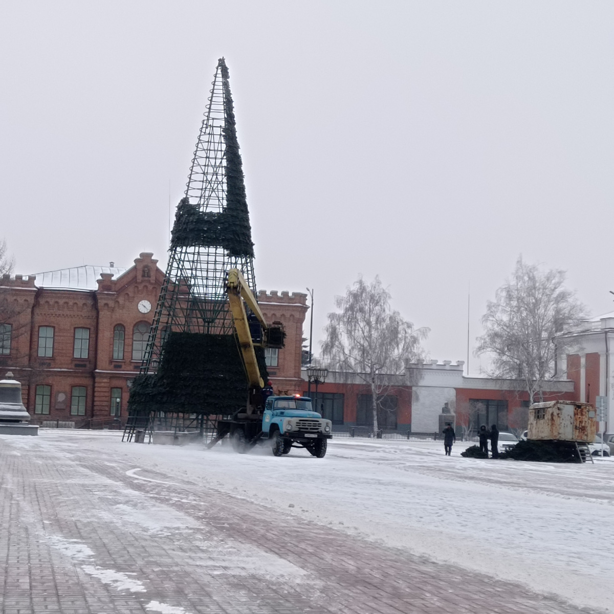 Работа идëт полным ходом. Ёлку почти собрали. Ни смотря на сегодняшний мороз в -30° Расправляют веточки. И крепят на каркас. Так же идет подготовка площади. Убирают снег. Также уберут большие вазоны. Скоро завезут ледяные блоки для горок и ледяного городка. Даже интересно, какие скульптуры придумали мастера. Спасибо за прочтение статьи. Продолжение следует. 🙂