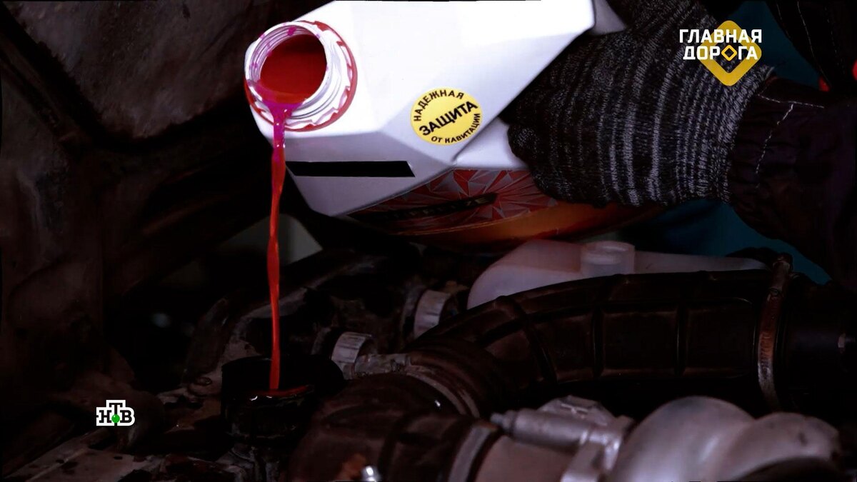[ Смотреть видео на сайте НТВ ] На улице прохладно, а мотор кипит? Охлаждающая жидкость стала мутной и поменяла свой цвет? Пора ее менять. От просроченного антифриза ржавеют система охлаждения и двигатель. А зимой эта жижа может замерзнуть. Сначала дайте мотору остыть хотя бы до 60 градусов. Выставляем регулятор температуры в салоне на максимум, чтобы при сливе и из печки вся жидкость вышла. Снимаем крышку на заливной горловине радиатора — так жидкость быстрее сольется, а затем откручиваем специальный сливной болт, чтобы удалить охлаждайку из двигателя. Антифризы разных типов смешивать нельзя, причем цвет не имеет значения. От химической реакции разрушится система охлаждения, а может и мотор. Исключение — универсальный G12. Вода для промывания должна быть комнатной температуры. Заливаем ее до отметки «минимум». Для максимального эффекта нужно прогреть двигатель и дать ему поработать на холостых оборотах 30 минут. Сливаем промывку, когда остынет мотор. Заливаем вторую часть средства и д