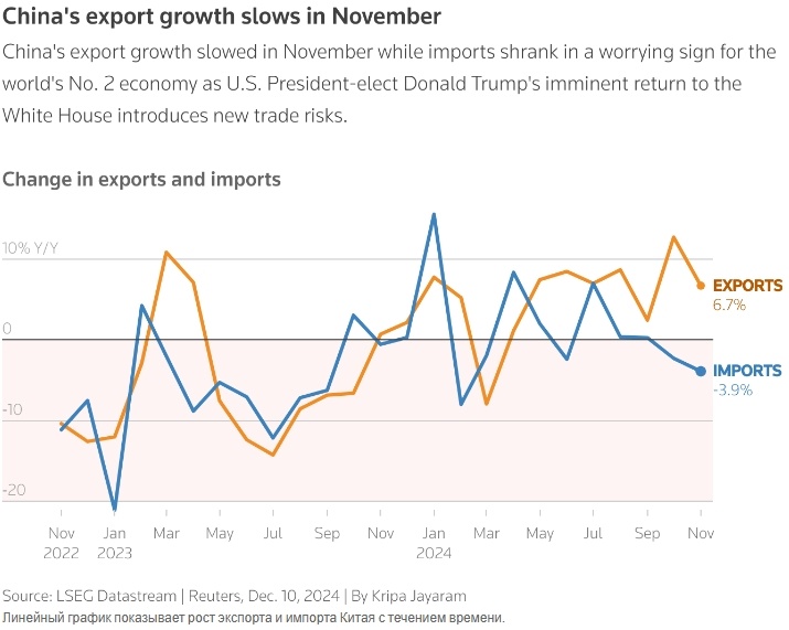 Экспорт Китая в ноябре резко замедлился, а импорт неожиданно сократился, что вызывает опасения в отношении второй по величине экономики мира. Возвращение Дональда Трампа в Белый дом может привести к новым торговым рискам.
