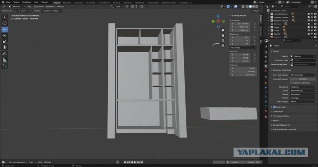2. В Blender из обычных прямоугольников нарисовал шкаф, даже 3 варианта разной конфигурации и направил на одобрение сперва жене, потом дочке. Выбор пал на тот где было больше всего полочек (что логично). Затем все размеры были распечатаны и отправились в цех по распилу ЛДСП рядом заказал фасады МДФ в плёнке.