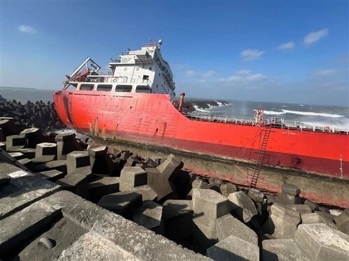 Танкер остановился под углом 15 градусов к волнорезу на каменной насыпи к югу от гавани Тайчжун в 30 метрах от берега. Пришлось искать нестандартное решение для спасения экипажа.