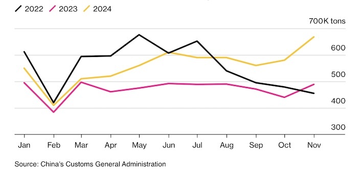 Китай отгрузил почти рекордные объемы алюминия в ноябре, поскольку экспортеры спешили воспользоваться налоговыми скидками, которые действовали до декабря. Ноябрьский экспорт алюминия достиг максимума с 2022 года. Источник: Главное таможенное управление Китая, Bloomberg В прошлом месяце Пекин объявил об отмене налоговой скидки в 13%, которая в течение многих лет способствовала росту экспортных продаж алюминия. Судя по всему, это решение спровоцировало ажиотажные продажи: трейдеры и производители пытались отгрузить как можно больше продукции до конца ноября. Экспорт необработанного алюминия и изделий из него вырос на 37% до 668 940 тонн в ноябре. Объем экспорта был выше лишь единожды — в мае 2022 года, когда мировой рынок алюминия столкнулся с серьезными перебоями после начала конфликта между Россией и Украиной. Экспортные скидки Китая прекратили действовать или были сокращены с 1 декабря для ряда товаров, включая медь и некоторые нефтепродукты. Это решение рассматривается как попытка бо