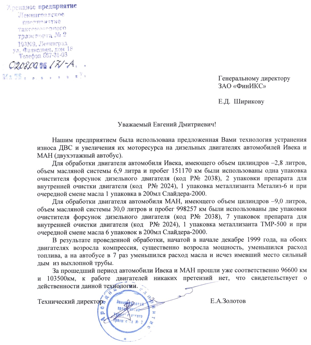 Постоянная ссылка (Permalink) Опубликовано пн, 18/03/2013 - 19:32 пользователем Manager. Нашим предприятием была использована предложенная Вами технология устранения износа ДВС и увеличения их моторесурса на дизельных двигателях автомобилей Ивека и МАН (двухэтажный автобус)... Постоянная ссылка (Permalink) Опубликовано пн, 18/03/2013 - 19:45 пользователем Manager. На основании положительных результатов лабораторных испытаний препарат-регенератор Lubrifilm Metal рекомендуется к внедрению для улучшения в эксплуатации антиизносных свойств деталей трения и стабилизации компрессии в цилиндрах автотранспортных двигателей.... Постоянная ссылка (Permalink) Опубликовано пн, 18/03/2013 - 20:10 пользователем Manager. Результаты тестов по компрессии при использовании препаратов Lubrifilm и препарата Amper Plus при обработке аккумулятора емкостью 55 А.ч.... Постоянная ссылка (Permalink) Опубликовано вт, 19/03/2013 - 11:22 пользователем Manager. В нашем предприятии были произведены сначала испыт