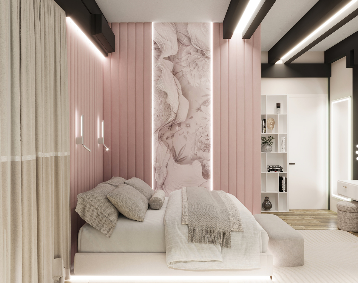 Детская для девочки десяти лет Именно с десяти лет начинается отсчет подросткового возраста. Девочка все еще ребенок, но уже личность, имеющая собственные вкусы и интересы, сложные эмоции. Иногда, при выборе дизайна для комнаты тинейджера, родители впадают в крайность. Они либо полностью руководствуются своим вкусом, либо разрешают ребенку делать что захочет. Лучше всего будет прислушаться к желаниям ребенка, но не выходить за рамки советов профессиональных дизайнеров. Цветовую палитру мы выбрали розово-бежевую, приглушенную. Она жизнерадостная, но в тоже время не чрезмерно яркая. Ее удачно подчеркивают черные балки фахверка, создавая эффект традиционного японского домика на столбах. Поскольку подросток проводит в своей комнате большую часть времени, мы постарались разделить помещение на функциональные зоны. Зона сна Это, в первую очередь, кровать с комфортным матрасом, чтобы растущий организм нормально развивался. Немаловажен и качественный текстиль из природных материалов. Зона учебы